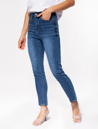 Синие слегка укороченные супер-эластичные джинсы skinny. В состав добавлены стрейчевые волокна, поэтому материал тянется, а модель комфортно садится по фигуре и не сковывает движения. Хорошо будут в сочетании с футболкой, блузкой или свитшотом, с обувью на низком каблуке.