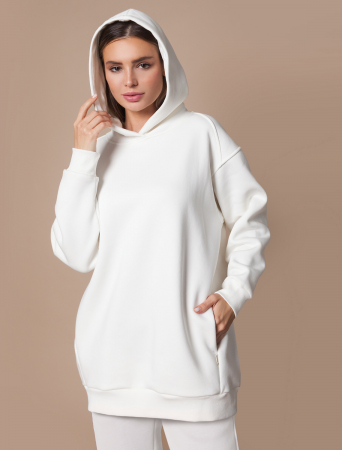 Свободное худи из легкого и объемного футера-трехнитки с карманами в швах. Наличие ПЭ в составе, способствует эластичности, формоустойчивости и теплу. Изделие украшено металлическим логотипом бренда. Совет стилиста: идеально для холодной погоды в костюме с брюками D44.100. В спорт шик или практичный аутфит комбинируйте с тренчем, безрукавкой, курткой-рубашкой, пальто.