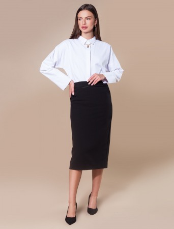 Классическая юбка-карандаш из поливискозы на подкладке. С кантом по линии талии из эко-кожи.Застегивается на молнию. Облегающий крой подчеркивает силуэт. Высокая посадка акцентирует талию. Незаменима в деловом стиле и прекрасна в более неформальном, повседневном образе.