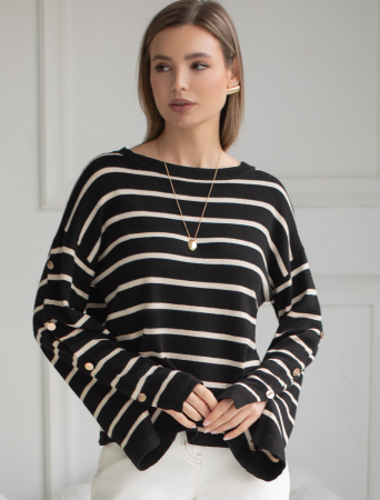 Джемпер свободного силуэта тонкой вязки выполнен из хлопка с вискозой. Модель с широкими рукавами и трендовыми разрезами во всю длину на золотистых пуговицах. Мягкая пряжа очень приятная к телу совершенно не колется. Изделие хорошо сочетается с низами из эко-кожи и денимом.