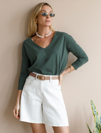 Оливковый джемпер с длинными рукавами и глубоким V-образным вырезом сшит из премиального хлопка. Однотонная хлопковая модель свободного кроя хорошо поддерживает комфортный для тела микроклимат. Благодаря вплетению эластановых волокон вещь хорошо сохраняет форму.