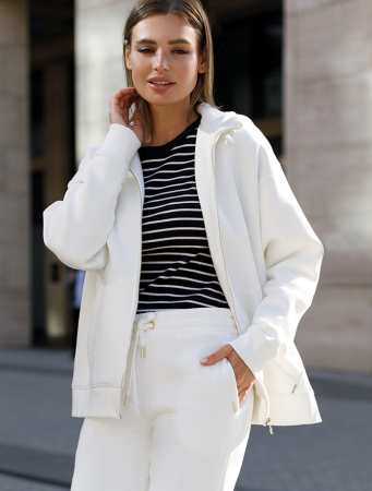 Худи на молнии выполнено из премиального футера трехнитки с теплым начесом. Модель дополнена боковыми карманами и золотистой фурнитурой, что поддерживает актуальный стиль спорт-шик. Свободный крой подходит для любой фигуры. Ранней осенью или поздней весной можно носить в качестве верхней одежды. Сочетается в костюме с брюками D44.133