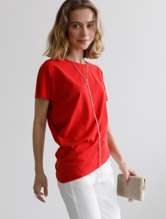 Футболка выполнена из премиального хлопка. Модель дополнена ассиметричным низом драпирующийся изящными волнами. Наличие эластана в составе изделия гарантирует комфорт и формоустойчивость. На рукаве металлический логотип бренда. Хорошо впишется как в праздничный образ, так и в повседневный аутфит.