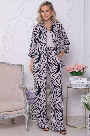 Комплект из комфортного вискозного текстильного полотна,состоит из рубашки и брюк.Рубашка свободного силуэта с центральной застежкой на пуговицы.Воротник отложной на стойке.