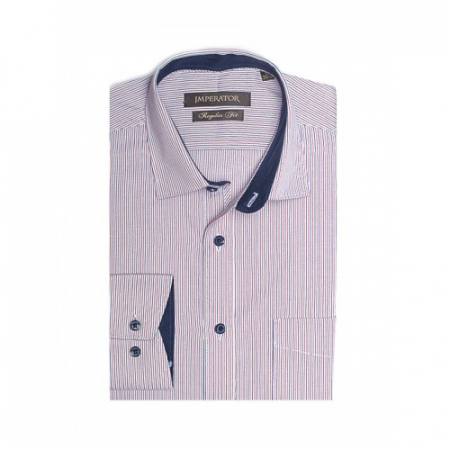 Пестротканый материал, полоски трех цветов: красный, белый, темно-синий. Отделка контрастной тканью внутри ворота и манжет делают рубашку нарядной и одновременно практичной в носке.
