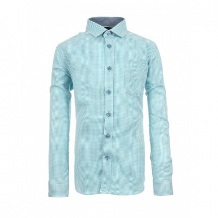 Состав: 65% хлопок, 35% полиэстер. Цвет бирюзовый. Рисунок: мелкая клетка. Отделка контрастной тканью по вороту, планке и на манжетах. Крой прямой. Длинный рукав. Товар сертифицирован.