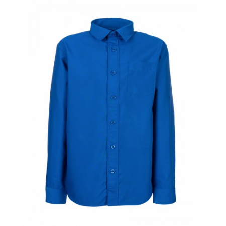 Синяя однотонная рубашка поможет адаптировать школьный комплект для теплой погоды.