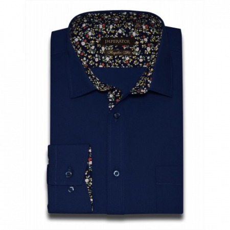 Модель с накладным нагрудным карманом, комбинированная контрастной принтованной тканью по внутренним вороту и манжетам. Цвет темно-синий. Крой прямой. Длинный рукав. Товар соответствует техническому регламенту о безопасности продукции легкой промышленности.