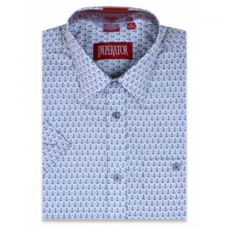 Принтованная модель приталенного кроя с накладным нагрудным карманом. Цвет голубой с принтом "якорь". Короткий рукав. Товар соответствует техническому регламенту о безопасности продукции легкой промышленности.