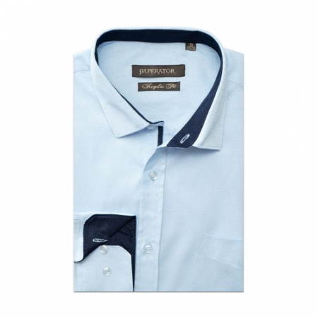 Модель комбинированная контрастной тканью по внутренним вороту и манжетам. Цвет голубой. Крой прямой. Длинный рукав. Товар соответствует техническому регламенту о безопасности продукции легкой промышленности.