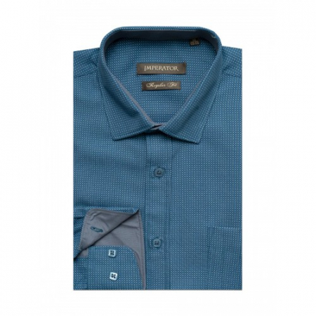 Цвет: темно-бирюзовый. Рисунок: классический принт. Отделка контрастной тканью по вороту, планке и на манжетах.