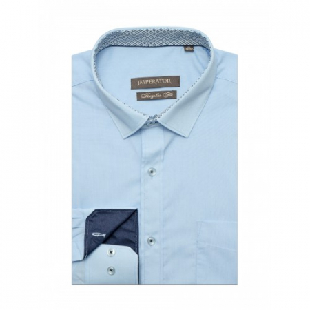 Модель приталенного силуэта с накладным нагрудным карманом, комбинированная контрастной тканью по внутренним вороту и манжетам. Цвет голубой. Длинный рукав.Товар соответствует техническому регламенту о безопасности продукции легкой промышленности.