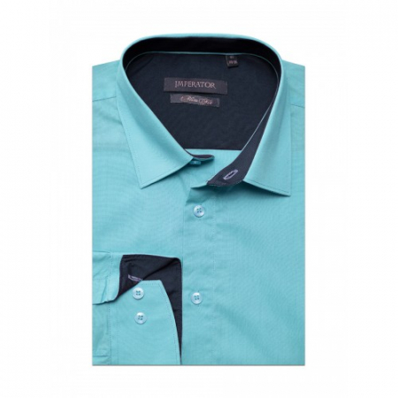 Модель приталенного силуэта, комбинированная контрастной тканью по внутренним вороту и манжетам. Цвет голубой. Длинный рукав. Товар соответствует техническому регламенту о безопасности продукции легкой промышленности.