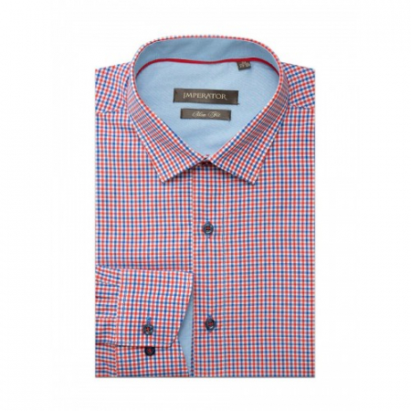 Модель приталенного силуэта, комбинированная контрастной тканью по внутренним вороту и манжетам. Цвет красный в синюю клетку. Длинный рукав. Товар соответствует техническому регламенту о безопасности продукции легкой промышленности.