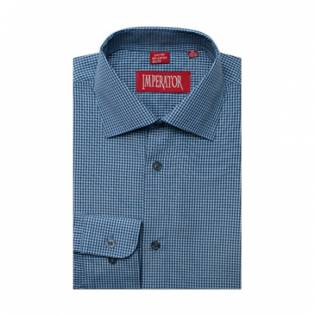 Модель приталенного силуэта, комбинированная контрастной тканью по внутренним вороту и манжетам.Цвет синий в мелкю клетку. Длинный рукав. Товар соответствует техническому регламенту о безопасности продукции легкой промышленности.