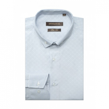 Модель приталенного силуэта, комбинированная контрастной тканью по внешним вороту и манжетам.Цвет серо-голубой (принтованный). Длинный рукав. Товар соответствует техническому регламенту о безопасности продукции легкой промышленности.