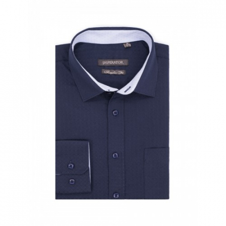 Модель приталенного силуэта с накладным нагрудным карманом, комбинированная контрастной тканью по внутренним вороту и манжетам. Цвет синий (точка). Длинный рукав. Товар соответствует техническому регламенту о безопасности продукции легкой промышленности.