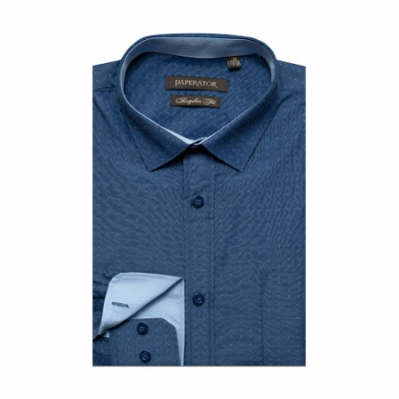 Модель приталенного силуэта, комбинированная контрастной тканью по внутренним вороту и манжетам. Цвет синий (принтованный).Длинный рукав. Товар соответствует техническому регламенту о безопасности продукции легкой промышленности.