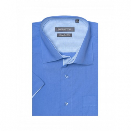 Модель прямого силуэта с накладным нагрудным карманом, комбинированная контрастной тканью по внутренним вороту и манжетам. Цвет синий. Короткий рукав. Товар соответствует техническому регламенту о безопасности продукции легкой промышленности.