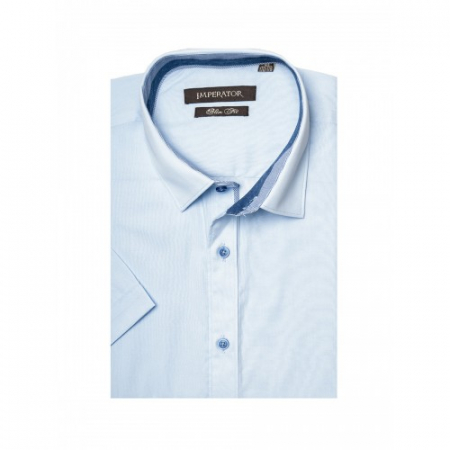 Модель приталенного силуэта с накладным нагрудным карманом, комбинированная контрастной тканью по внутренним вороту и манжетам. Цвет голубой. Короткий рукав. Товар соответствует техническому регламенту о безопасности продукции легкой промышленности.