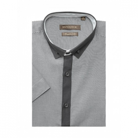 Модель приталенного силуэта, комбинированная контрастной тканью по внешнему вороту и полочке. Цвет серый (мелкая клетка). Короткий рукав.Товар соответствует техническому регламенту о безопасности продукции легкой промышленности.