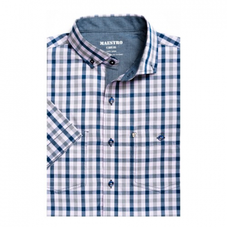 Модель прямого силуэта с двумя накладными нагрудными карманами с воротником "button-down" (на пуговицах). Цвет фиолетовый/синий/серый (клетка). Короткий рукав. Товар соответствует техническому регламенту о безопасности продукции легкой промышленности.