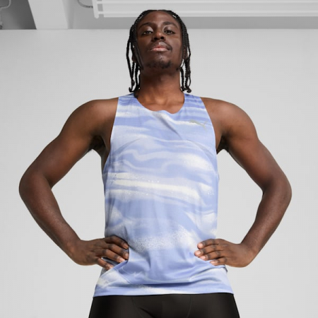 Chase your PR with confidence in our latest singlet. Featuring ULTRASPUN technology for elite performance, thermo-regulation, and all-over print, this sleeveless tee ensures you stay cool and friction-free. Bonded armholes and perforated jacquard details make every run a victory.