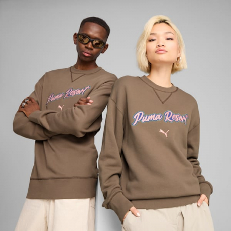 Step up your casual game with this PUMA crew. Featuring a graphic badge with raised chain stitch and embroidered outlines, it's all about timeless elegance. Ribbed V-Cross stitching and tonal details add a chic touch.