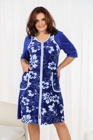 Мягкий женский халат из велюра. Пятнистый дизайн, однотонные рукава и вставки, застегивается на молнию, рукава ниже локтей, по бокам карманы, длина приблизительно до коленей. Размеры от 46 до 62. Имеется возможность приобрести данный товар по розничной цене.