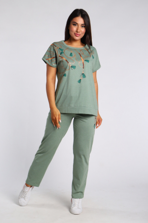 Костюм женский из кулирного полотна состоит из кофты и брюк. Кофта - прямого кроя, горловина круглая, спущенное плечо, низ изделия на поясе. Брюки - прямого кроя, верх на поясе с резинкой, в боковых швах внутренние карманы, низ обработан на плоскошовной машине. На полочке и брюках принт. Такой комплект отлично подойдет для дома, отдыха.