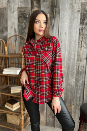 Женская туника-рубашка на пуговицах, с отложным воротником, свободная, с удлиненной спинкой и фигурной линией низа. Рукав удлиненный, на манжете.