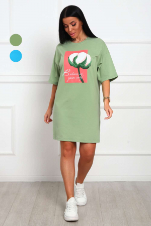 Туника женская прямого силуэта. Низ изделия прямой. Длинна выше колена, плечо спущенное, рукав короткий. Горловина круглой формы, обработана планкой с отделочной строчкой по шву притачивания. Принт (шелкография) располагается по центру переда.