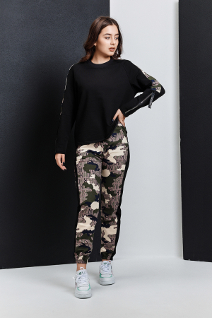 Костюм состоит из туники и брюк. Туника прямая, с округлой горловиной, средней дины. Рукав реглан, длинный, с лампасом из отделочного полотна вдоль рукава и декоративными молниями. Горловина обработана обтачкой из эластичного полотна. Брюки прямые, на поясе, с боковыми карманами, с лампасами из отделочного полотна вдоль боковых швов, с резинкой по низу.