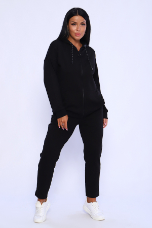 Костюм выполнен из трикотажного полотна футер 2-х нитка. Толстовка свободного силуэта, имеет капюшон с люверсами и шнурком. Линия плеча спущена (в измерениях длина рукава указана от шва втачивания рукава), толстовка с центральной бортовой застежкой на молнии, в нижней части полочек расположены два кармана. Манжеты рукавов и пояс толстовки изготовлены из эластичного трикотажного полотна кашкорсе. Брюки полуприлегающего силуэта, передние половинки выполнены ассиметрично из нескольких деталей, задние половинки брюк с кокеткой, по бокам расположено два кармана, низ обработан подгибкой и имеет разрезы в боковых швах, пояс брюк притачной. Ткань Костюма плотная, теплая, приятная к телу, согревающая в прохладную погоду, данная модель не обтягивает фигуру, скрывает мелкие огрехи силуэта, костюм уместен для носки в любых повседневных ситуациях и подходит для любого типа фигуры. На модели представлен костюм 46 размера. Рекомендуемый режим стирки 30 t.