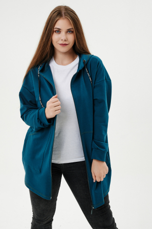 Толстовка женская прямого силуэта до линии бедер, в нижней части заужена по бокам. Рукав втачной с заниженной линией плеча, с манжетой. Капюшон с люверсами и декоративными шнурками. Застежка на тесьму-молнию. В нижней части полочки два накладных кармана. Цвет изумруд в разных оттенках.