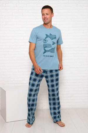 Пижама мужская: футболка с короткими рукавами и оригинальным принтом на груди, брюки с боковыми карманами в швах. Комфорт 100%-ого хлопкового трикотажа.