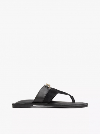 Tommy Hilfiger women's flip flop. Premium leather and suede lend luxurious texture to these sandals designed with a polished horsebit hardware accent for an elevated look.