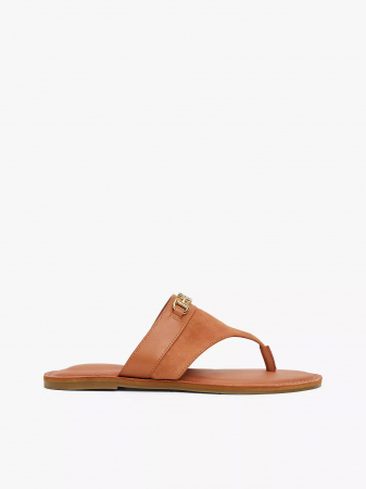 Tommy Hilfiger women's flip flop. Premium leather and suede lend luxurious texture to these sandals designed with a polished horsebit hardware accent for an elevated look.