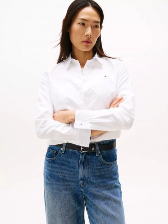 Tommy Hilfiger women's shirt. Shirting made with Oxford cloth is soft, breathable, and durable. Our version is made from organic cotton with a hint of stretch. Any way you wear it, our comfortable, lightweight button-up is the cornerstone of versatile and effortless ensembles.