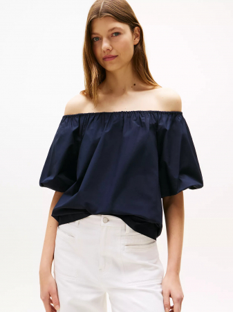 Tommy Hilfiger women's top. Gathered puff sleeves and an elastic neckline add to the boho feel of this pullover top. This versatile silhouette can be worn off the shoulder, and is made from soft cotton poplin to keep you cool and comfortable.