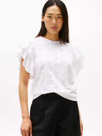 Tommy Hilfiger women's top. Made from a breathable cotton-jersey knit with a smooth, soft feel and excellent stretch, our top is super comfortable. This summer-ready layer is designed with an allover embroidered eyelet design and breezy ruffle sleeves.