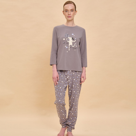 Состав: верх: 95%хлопок 5%эластан, низ: 95%хлопок 5%эластанОписание: Костюм пижамный женский. В составе ткани преобладает высококачественный хлопок — комплект для сна мягкий, гипоаллергенный и хорошо пропускает воздух. В хлопковой пижаме вам будет тепло и уютно во время сна. Эластан помогает модели надолго сохранить первоначальную форму. Джемпер и брюки умеренного объёма, плечо немного спущено, рукава широкие и свободные — в пижаме очень удобно спать. В поясе брюк мягкая и широкая резинка — не перекручивается и не давит. Отделка горловины из эластичной рибаны — она не растягивается, пижаму удобно надевать и снимать. Манжеты брючин широкие, из основной ткани — не передавливают ногу. Хлопковая пижама украшена милым, «няшным» принтом в виде танцующей собачки с зонтиком, надпись переводится: «нет дождя — нет цветов» — поймайте позитивное настроение! Пижамный костюм неприхотлив в уходе. Принт мягкий и прочный, без проблем переносит многочисленные стирки. Пижама женская с брюками подходит как для сна, так и просто для отдыха дома. Помните о правильном уходе за изделием: рекомендуется стирать при температуре не выше 30 °C, без предварительного замачивания, с изнанки. Это поможет сохранить качество и цвет пижамы на длительное время. Не забывайте о выборе правильного размера. Используйте таблицу размеров на фотографии, чтобы выбрать подходящий для себя вариант. Обратите внимание, что цвет товара на экране вашего устройства может отличаться от реального.