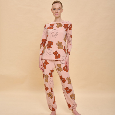 Состав: верх: 95%хлопок 5%эластан, низ: 95%хлопок 5%эластанОписание: Костюм пижамный женский. В составе ткани преобладает высококачественный хлопок — комплект для сна мягкий, гипоаллергенный и воздухопроницаемый. В хлопковой пижаме вам будет тепло и уютно во время сна. Эластан помогает модели надолго сохранить первоначальную форму. Джемпер и брюки умеренного объёма, плечо немного спущено, рукава широкие и свободные — в пижаме очень удобно спать. В поясе и по низу брюк мягкие и широкие резинки — не перекручиваются и не давят. Отделка горловины из эластичной рибаны — она не растягивается, пижаму удобно надевать и снимать. Хлопковая пижама украшена милым, «няшным» сплошным принтом в виде плюшевых медвежат — побалуйте своего внутреннего ребёнка. Пижамный костюм неприхотлив в уходе. Принты мягкие и стойкие, без проблем переносят частые стирки. Пижама женская с брюками подходит как для сна, так и просто для отдыха дома, пижамной вечеринки. Помните о правильном уходе за изделием: рекомендуется стирать при температуре не выше 30 °C, без предварительного замачивания, с изнанки. Это поможет сохранить качество и цвет пижамы на длительное время. Не забывайте о выборе правильного размера. Используйте таблицу размеров на фотографии, чтобы выбрать подходящий для себя вариант. Обратите внимание, что цвет товара на экране вашего устройства может отличаться от реального.