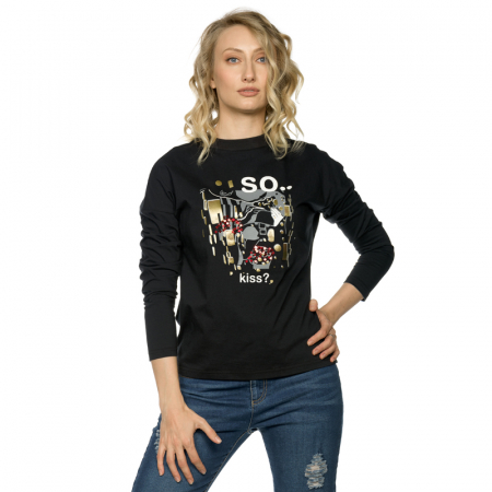 Состав: 100%хлопокОписание: Новинка! Джемпер женский свободного объема со спущенной линией плеча, горловиной из рибаны, стойким эластичным принтом с элементами золота, в стиле картины Климта и вышивкой деликатными красными пайетками-монисто. Перевод Итак... поцелуй?