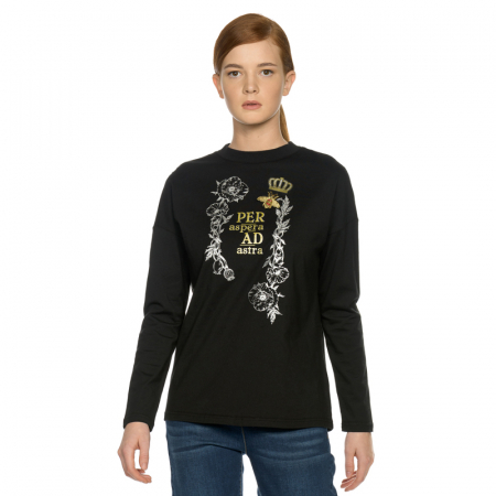 Состав: 100%хлопокОписание: Модный лонгслив для женщин из 100% хлопка умеренного объема со спущенным плечом - всегда актуальный силуэт. Ткань мягкая, дышащая, приятная на ощупь. Украшение джемпера - богатый актуальный принт из золотого и серебряного металлика и броши в виде мотылька, вышитого золотыми нитками, бисером и стразами. Лонгслив идеально подойдет как для повседневной носки, так и на выход.