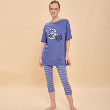 Состав: верх: 95%хлопок 5%эластан, низ: 95%хлопок 5%эластанОписание: Пижама с леггинсами женская. В составе ткани преобладает высококачественный хлопок — комплект для сна мягкий, гипоаллергенный и дышащий. В хлопковой пижаме вам будет комфортно и уютно во время сна. Благодаря эластану изделие надолго сохранит первоначальную форму. Футболка удлинённая, силуэта оверсайз, плечо спущено, рукава широкие — в пижаме очень удобно спать. В поясе комфортных лосин длиной 7/8 мягкая и широкая резинка — не перекручивается и не давит. Отделка горловины из эластичной рибаны — она не растягивается, пижаму удобно надевать и снимать. Хлопковая пижама украшена милым, «няшным» принтом в виде забавного лемура, надписи переводятся: «креативные вещи», «я просто хочу выпить кофе и спать». Легинсы в горизонтальную полоску. Пижамный костюм неприхотлив в уходе. Принт эластичный и мягкий, легко переносит частые стирки. Милая пижама подходит как для сна, так и просто для дома и отдыха. Помните о правильном уходе за изделием: рекомендуется стирать при температуре не выше 30 °C, без предварительного замачивания, с изнанки. Это поможет сохранить качество и цвет пижамы на длительное время. Не забывайте о выборе правильного размера. Используйте таблицу размеров на фотографии, чтобы выбрать подходящий для себя вариант. Обратите внимание, что цвет товара на экране вашего устройства может отличаться от реального.