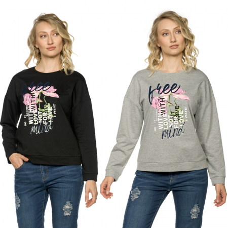 Состав: 65%полиэстер 35%хлопокОписание: Свитшот женский среднего объема из пластичного футера со слегка спущенным плечом, комфортным объемом рукава, манжетами из основной ткани и стойким эластичным принтом с элементами глянца в шрифте. Перевод Делай это с любовью, а не ради любви. Свободный ум. Перевод с японского Наша любовь в наших сердцах.