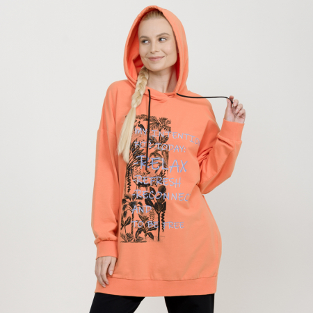 Состав: 96%хлопок 4%эластанОписание: Удлиненное худи мангового цвета большого объема с эластичным принтом с глянцем. Манжеты по низу рукава и низу изделия из рибаны. Объем капюшона регулируется шнурком черного цвета. Перевод Мои намерения на сегодня расслабиться, освежиться, перезагрузиться и быть свободной.