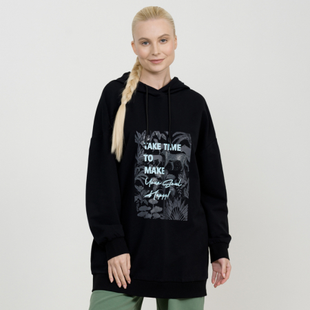 Состав: 96%хлопок 4%эластанОписание: Удлиненное худи большого объема с эластичным принтом с глянцем. Манжеты по низу рукава и низу изделия из рибаны. Объем капюшона регулируется шнурком черного цвета. Перевод Найдите время, чтобы сделать свою душу счастливой.