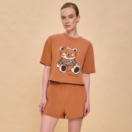 Состав: верх: 95%хлопок 5%эластан, низ: 95%хлопок 5%эластанОписание: Пижама женская с шортами. В составе ткани преобладает высококачественный хлопок — комплект для сна мягкий, гипоаллергенный и хорошо пропускает воздух. В хлопковой пижаме вам будет комфортно и уютно во время сна. Эластан помогает модели надолго сохранить первоначальную форму. Футболка укороченная (кроп-топ), свободная, плечо спущено, рукава широкие — в пижаме очень удобно спать. В поясе шорт мягкая и широкая резинка — не перекручивается и не давит. Отделка горловины из эластичной рибаны — она не растягивается, пижаму удобно надевать и снимать. Хлопковая пижама украшена милым, «няшным» принтом в виде плюшвого медвежонка в тельняшке, надписи переводятся: «я не застенчивая», «просто избирательно общительна» — побалуйте своего внутреннего ребёнка. Пижамный костюм неприхотлив в уходе. Принт эластичный и мягкий, легко переносит частые стирки. Милая пижама подходит как для сна, так и просто для отдыха дома, пижамной вечеринки. Помните о правильном уходе за изделием: рекомендуется стирать при температуре не выше 30 °C, без предварительного замачивания, с изнанки. Это поможет сохранить качество и цвет пижамы на длительное время. Не забывайте о выборе правильного размера. Используйте таблицу размеров на фотографии, чтобы выбрать подходящий для себя вариант. Обратите внимание, что цвет товара на экране вашего устройства может отличаться от реального.